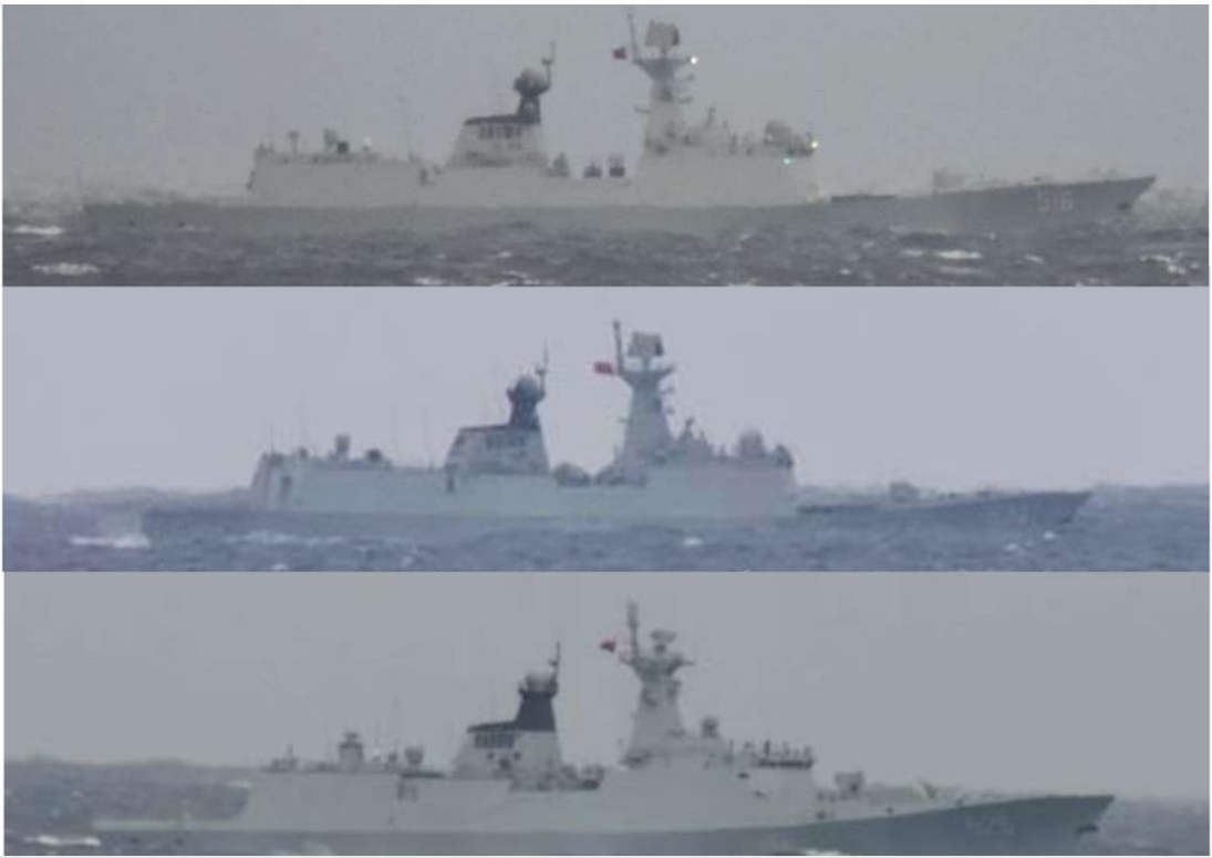 12月22日に海警と共同航行する中国海軍フリゲート艦(防衛省提供)